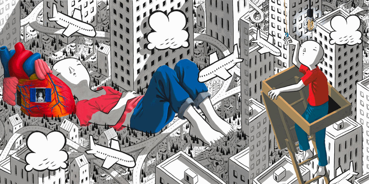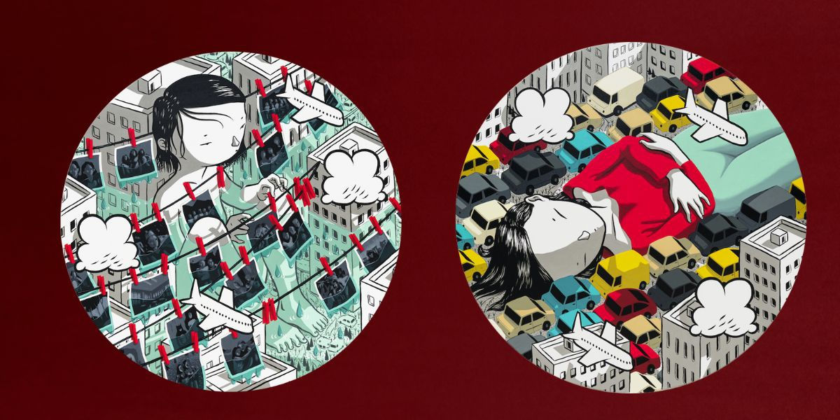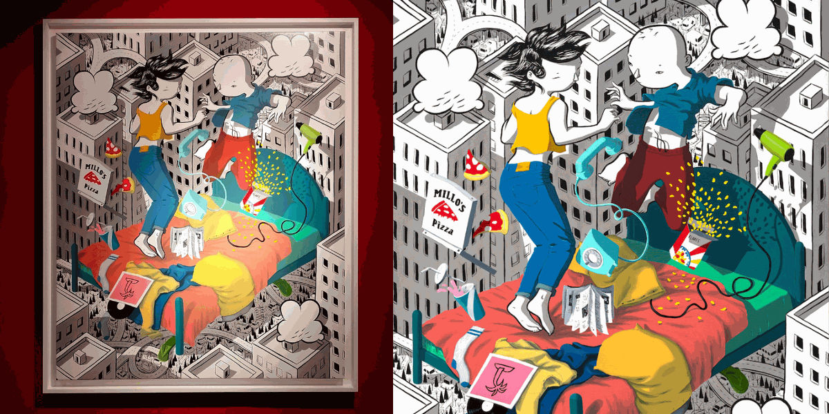 The unknown chaos generated by the Artist’s visionary mind leads us toward a central point in the canvas where a familiar scene appears reassuring and comforting. Painted with an elaborate illustrative technique on large size canvases, Millo’s artworks are like open doors to the human mind. Reflecting our most intimate sensations such as Love, Hope, Strength, Loneliness, and Fear hence the protagonists of Millo’s narratives are often a couple sharing a moment of tenderness calling our attention to stop the frenetic stream of time and carry us back to the simplicity of human feelings. In a meticulously calculated balance between maximalism and minimalism, Millo generates a visionary code which stands as completely unique both in the street art movement and the neo-surrealist scene.