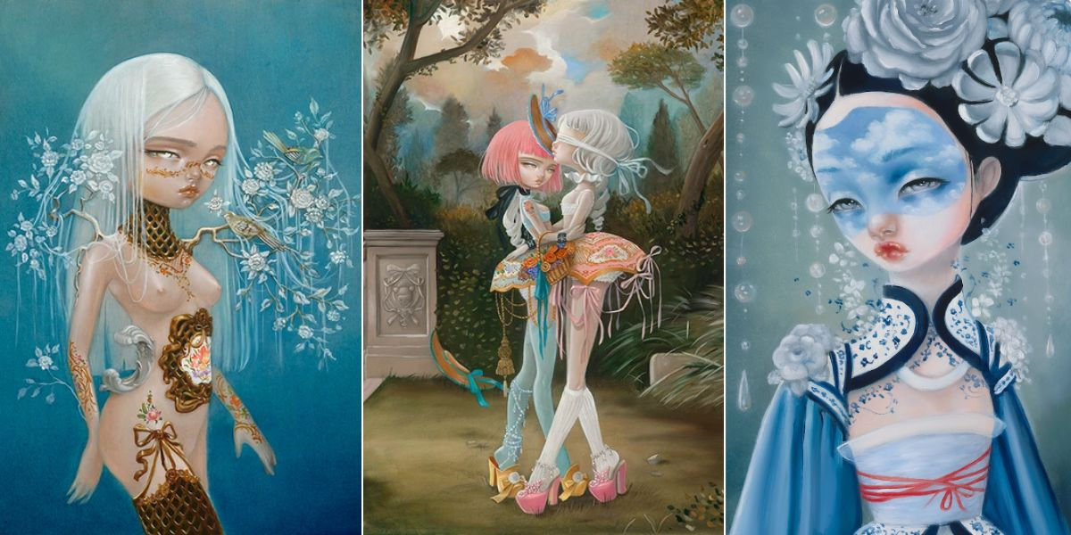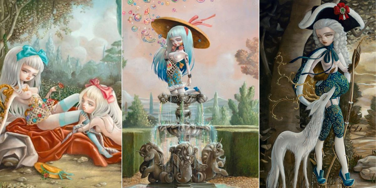 Rococo and the classical arts were always a big love of my life since childhood. I grew up listening to operas and rewatched ballets on my VHS, obsessed with movies like Amadeus and Farinelli. Later on as a teen I discovered the surrealists and their unexpected use of images and composition. When I was twelve I asked my parents for a big Taschen Dali book for my birthday. The next year I asked for Magritte. I was drawn so strongly to both 18th century arts and modern surrealism that I made it my life effort to merge them into a thing of my own. They form the foundations of my aesthetic, along side with Japanese anime and other popular illustrations…My style slowly formed into what it is.