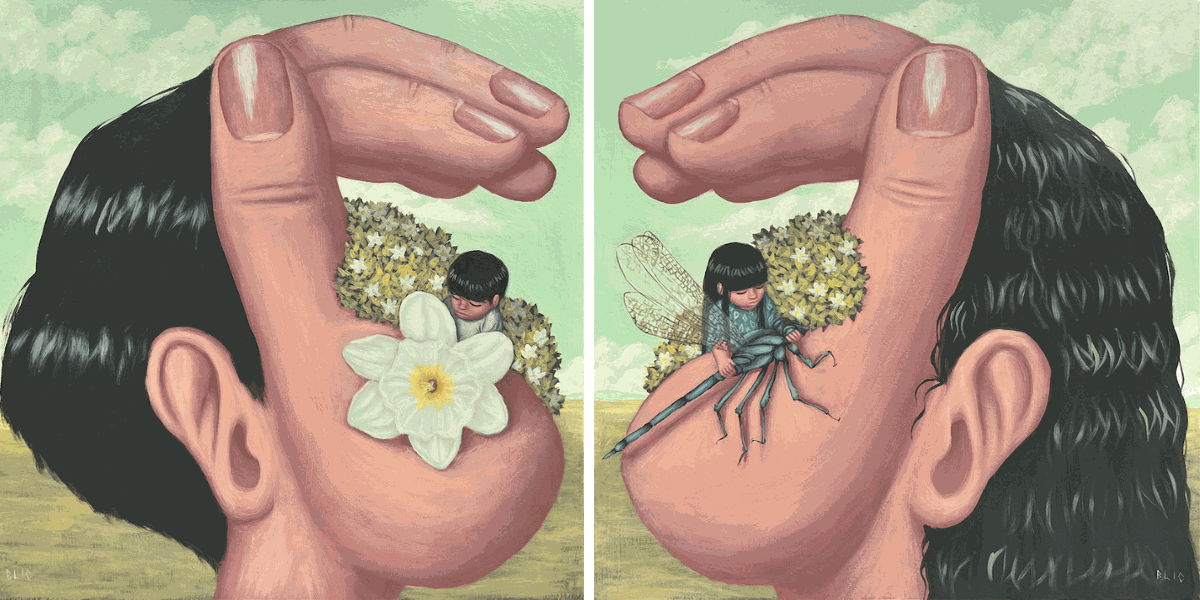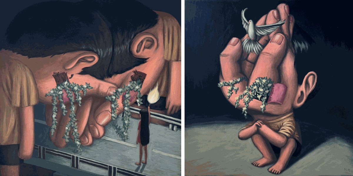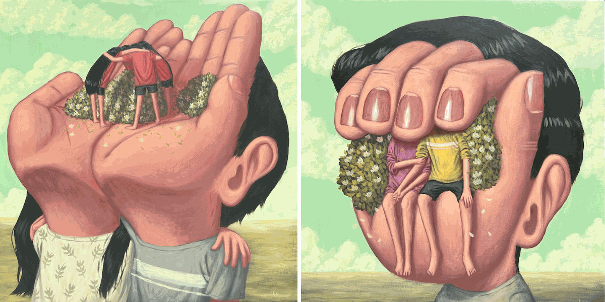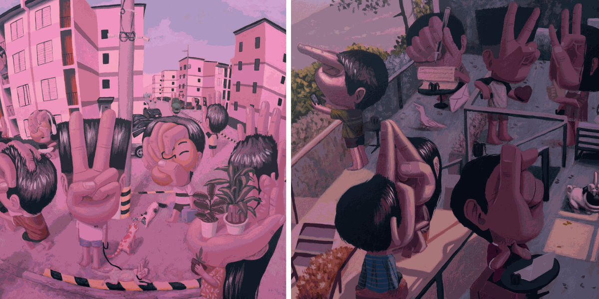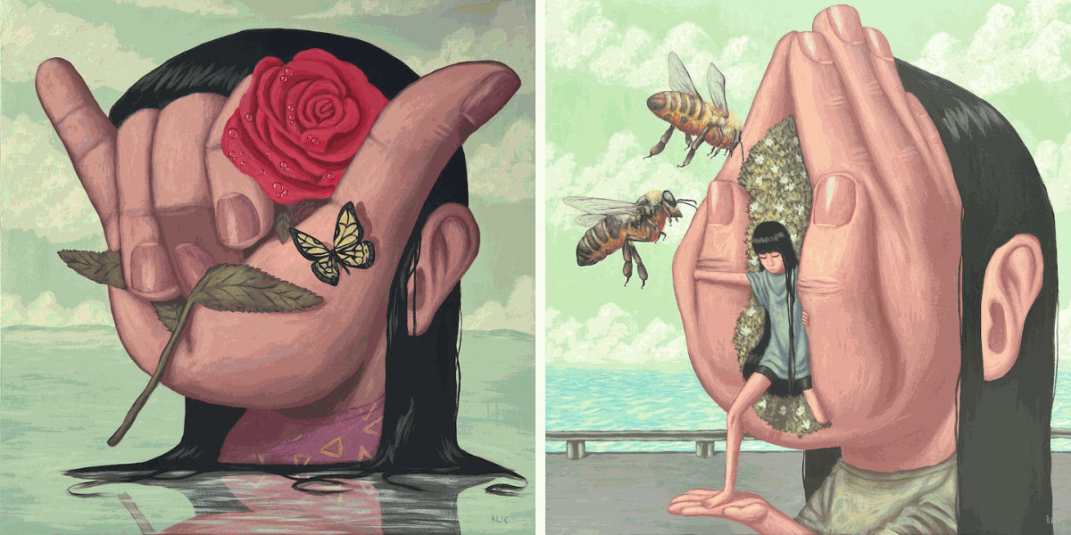 3 - In Asian culture, the theme of animism is prevalent, giving each object its own soul and life. In your paintings, you emphasize the humanization of hands. How much of this inspiration comes from animism, and how much is inspired by body language and communication? Does sign language also play a role in your work?