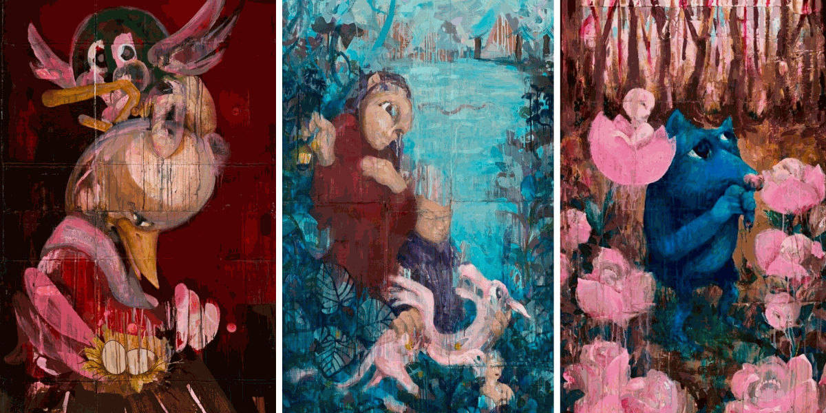 As I paint intuitively, my painting process often begins with an accident or a stain. These 'accidents' allow me to see and feel different emotions, stories, and compositions. Since the origin of the painting is as experimental as it gets, the narrative evolves according to the viewer's interpretation. Their contributions shape the story from that point forward. With the 'Isola' series specifically, I aim to transport viewers into a realm of captivating characters and mysterious narratives. Through this collection, I hope viewers find themselves drawn into the unique stories and emotions evoked by each piece, ultimately experiencing a sense of wonder and connection with the surreal landscapes and characters within.