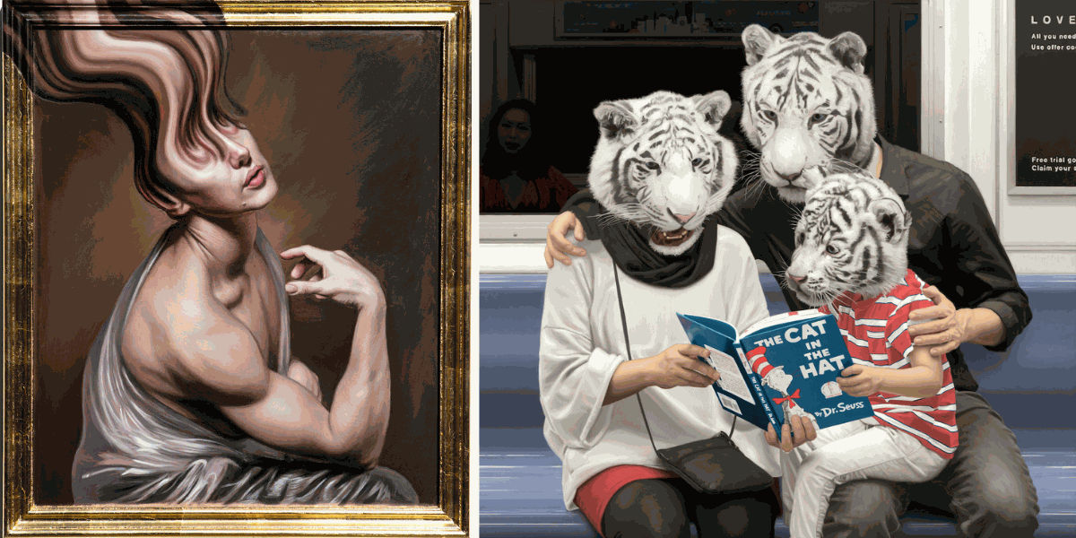 For the artist, animals become manifestations of his subjects' subconscious, gradually revealing their true essence and identity. His paintings, inspired by the techniques of academic and naturalistic painters of the 19th century, create incredible and surreal yet detailed scenarios, capturing the viewer with a sense of wonder and disbelief.