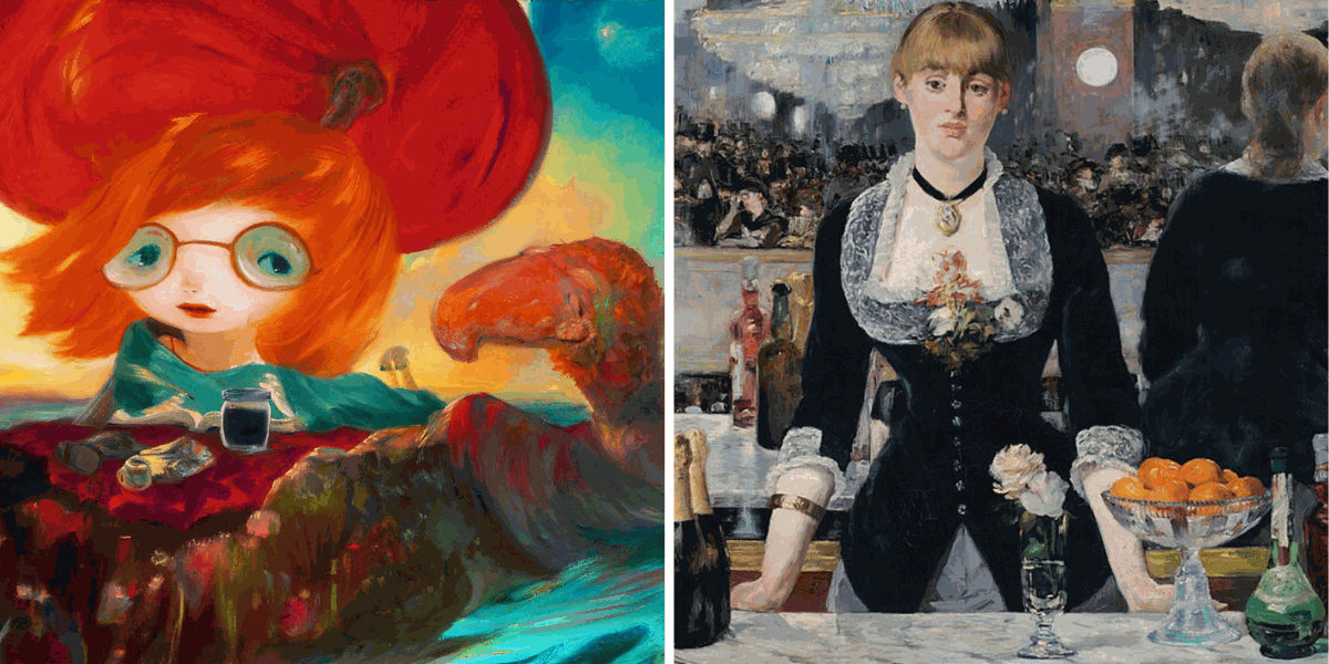 This layered visual experience evokes a sense of depth and complexity reminiscent of Édouard Manet's 1882 masterpiece "A Bar at the Folies-Bergère".