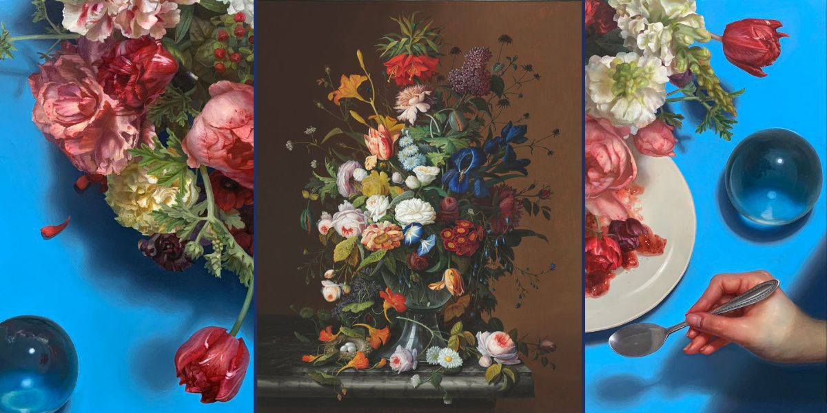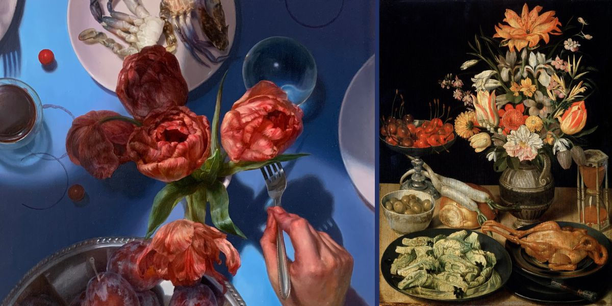 This extraordinary artist draws inspiration from 17th-century Still Life, reinterpreting this rare genre in contemporary art with a unique, authentic, and delicate style. Her Still Life paintings depict tables laden with flowers, candles, mirrors, crystal spheres, cakes, meat, and fish. The hands featured in her paintings introduce an element of movement and "disruption" from traditional Still Life. These hands emerge, reaching to grab some delicious food or holding a wine glass or cutlery.