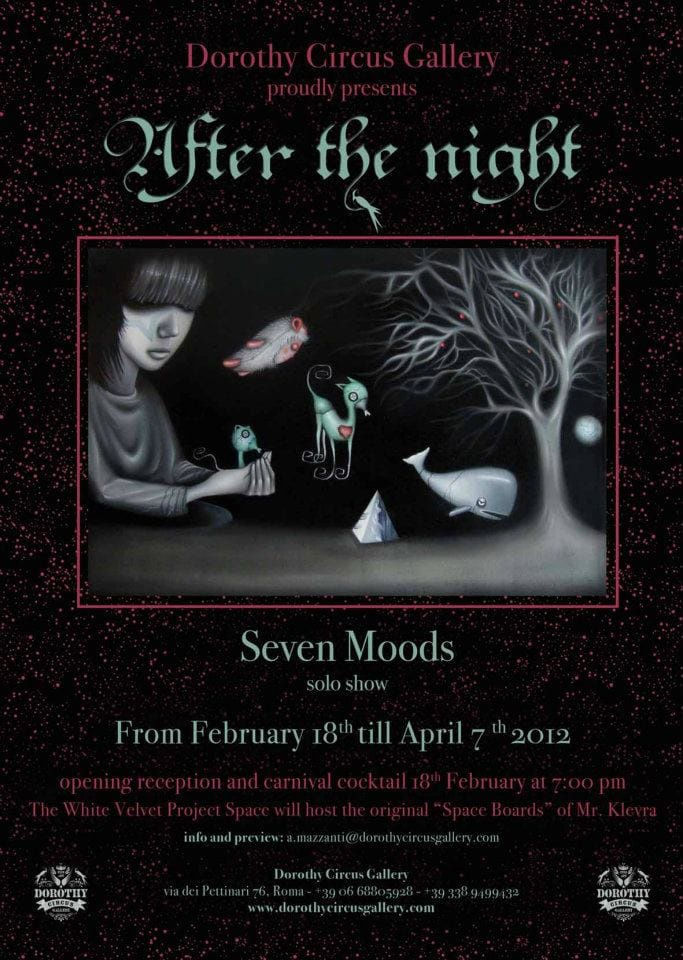 The young Italian artist Marco Pisanelli aka Seven Moods, presents for his first solo exhibition ten brand new oils on canvas. On the backdrop of an apocalyptic 2012, glimpse the first signs of a new possible world.