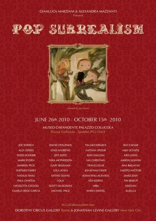 The forty artists exhibited are the major international exponents of Pop Surrealism, like its founder Mark Ryden, along with Joe Sorren, Todd Schorr, Shepard Fairey, Marion Peck, Camille Rose Garcia, Alex Gross, Ron English, Gary Baseman, Tim Biskup, Sas Christian, Kris Lewis, Ray Caesar, Jeff Soto, Travis Louie, David Stoupakis, James Jean, Adam Wallacavage, Tara McPherson, Missvan, Lola, Esao Andrews, Scott Musgrove, Jonathan Viner, Naoto Hattori Natalie Kukula Abramovich, Kathie Olivas, Natalie Shau, Mijn Schatje, Ana Bagayan, Michael Page, Tim McCormick, Nathan Spoor, Paul Chatem, Ken Keirns, Aren Hertel, Leila Ataya, Aaron Jasinski, and the only Italian leaders Nicoletta Ceccoli and Niba. In perfect harmony with the Surrealist roots of the thirties, the prophecies of figurative pop regenerate in a constant movement between the registration of real and immediate reworking dream. Landscapes, bodies, animals, history, nature, objects: this is the world reinterpreted by Pop Surrealism. A no-space where everything looks like the real thing, but where we perceive suspended atmospheres, a sense of agonizing waiting and silence, doubt and danger, where abnormal silences or strange noises are coming. This is a world similar to ours, where certain domestic and individual landscapes’ meaning are inverted and expressed by classical painting technique. The favorite subjects are pop icons, broadcasted by leisure media that live in our collective imagination from the world of fairy tales on. The topics vary from the vitality of childhood and adolescence to moral aspirations and chronicles of everyday life. At the same time it exceeds the unexpected and involves the incredible metropolitan, recreating a possible contemporary surrealism, son of a transverse, versatile and electronic era.
