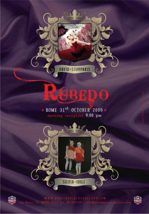 Dorothy Circus Gallery is raising its curtains on its exhibition season with the David Stoupakis and Silivia Idili duo show titled “Rubedo”. This exhibition evokes the suggestive theme of Rubedo and the world of alchemy. Rubedo is the fourth and last stage of the opus alchemicum in which the final purification comes true due to blood. Spirit melts into the material world and this reminds not of a Halloween night of darkness and death, but of a sparkling noir carnival, an unusual way to achieve purification and elevation. Dorothy Circus Gallery invites its public to a charming itinerary: the effort of the alchemic science to reach the Philosopher’s Stone is an evocative background for a series of artworks in which red represents the spiritual travel of the Being. This reminds us of Jung’s words:“But in the state of whiteness one does not live in the true sense of the world, it is a sort of abstract, ideal state. In order to make it come alive it must have “blood”, it must have what the alchemists called rubedo, the redness of life. Only the total experience of being can transform this ideal state of the albedo into a fully human mode of the existence. Blood alone can reanimate a glorious state o consciousness in which the last trace of blackness is dissolved, in which the devil no longer has an autonomous existence but rejoins the profound unity of the psyche. Then the opus magnum is finished: the human soul is completely integrated”. (C.G. Jung)