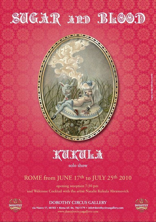 The sweetness of sugar, mixed with the sour taste and pungent of blood is the guiding concept of the upcoming exhibition at Dorothy Circus Gallery, from June 17th to July 25th, dedicated to Nataly Abramovich, aka Kukula. The young Israeli artist was born in a small town near Tel Aviv, inhabited mostly by former military and their families. She grew up among the ghosts of the Holocaust and the political tensions of the Israeli-Palestinian conflict where she’s been reworking an interior landscape of dreams and childhood that we can find in her art. Kukula herself seemed destined to military life, so far from her colors, fantasies, obsessions and her passion for illustrated stories. Reality’s blood melts with sugar’s childhood fantasy to create a world where the characters are girls and dolls, elements that characterize all her works.