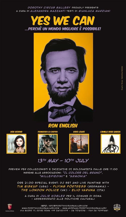 During the opening night of “Yes We Can”, starting at 9pm, there will be also a live event curated by Julie Kogler, “Art in Motion”. This consists of a live painting experience together with the American artist Tim Biskup – another great protagonist of Pop Surrealism – Flying Fortress (Germania), The London Police (UK) and Elio Varuna (Italia). Following this live painting, there will be a Dj set by Tim Biskup.