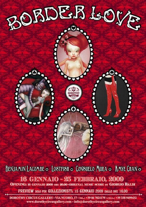 During its first year of activity, Dorothy Circus Gallery has gone through many journeys. By opening its doors to the world of Pop Surrealism, the Gallery has shone a light on the dark sides of adult tales; it has brought back to the surface new mythologies, it has destroyed and recreated the puzzle of rage, it has turned upside down and re-generated the nostalgic subconscious of people. This time, extreme love will be the protagonist of the current show. This time, DCG’s challenge will be to tell through artworks by Lostfish, Benjamin Lacombe, Kmye Chan, and Consuelo Mura today’s loves: precarious, difficult to understand, private, often invisible. Stories, dynamics, plays whose protagonists stand on the borderline between healthiness and madness; like unbound lovers who are still linked in some way. There are numerous faces of modern love that have crossed the limit of good manners, full with respectability and brainwashing, rebels, but also filled with an antique spirituality, fed by solitude and by a passion that becomes a drug for the mind and for the soul. The smiles of that love that finds its consciousness in the eroticism of misunderstandings, following the footsteps of joy like a promises of the impossible, which overlooks rules and goes beyond in the absurdity of a surreal intimacy, made of sex and possess, of the fusion and marriage of senses.