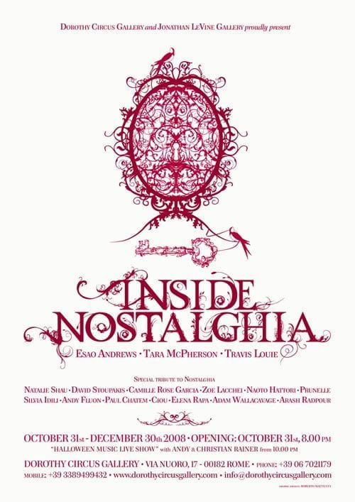 Perfect is the description of this image given us by Tara McPherson with her playful, bizarre and multicoloured cross-section of the female figure, made of open hearts, extracted from their bodies like pieces of a puzzle. The past returns to light, as if it was emerging from an old photo album, in the black and white portraits of anthropomorphic animals dressed in period costumes, result of Travis Louie’s impressive pictorial technique, of evident Victorian inspiration. Essential is the symbolic, and extremely romantic, “key” that lays in the hands of the young and restless Esao Andrews who, with his faceless faces and submerged paradises, is metaphorically opening the imaginary gate of the inconnu, joining the guardians of a dark legacy.