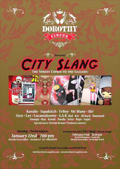 “City Slang – The Street comes to the gallery” is the fuse that triggers an inexhaustible artistic charge that isn’t pleased with the city walls, but that invades the sophisticated spaces of the art system, in order to release a violent and explosive burst of shapes and colours.