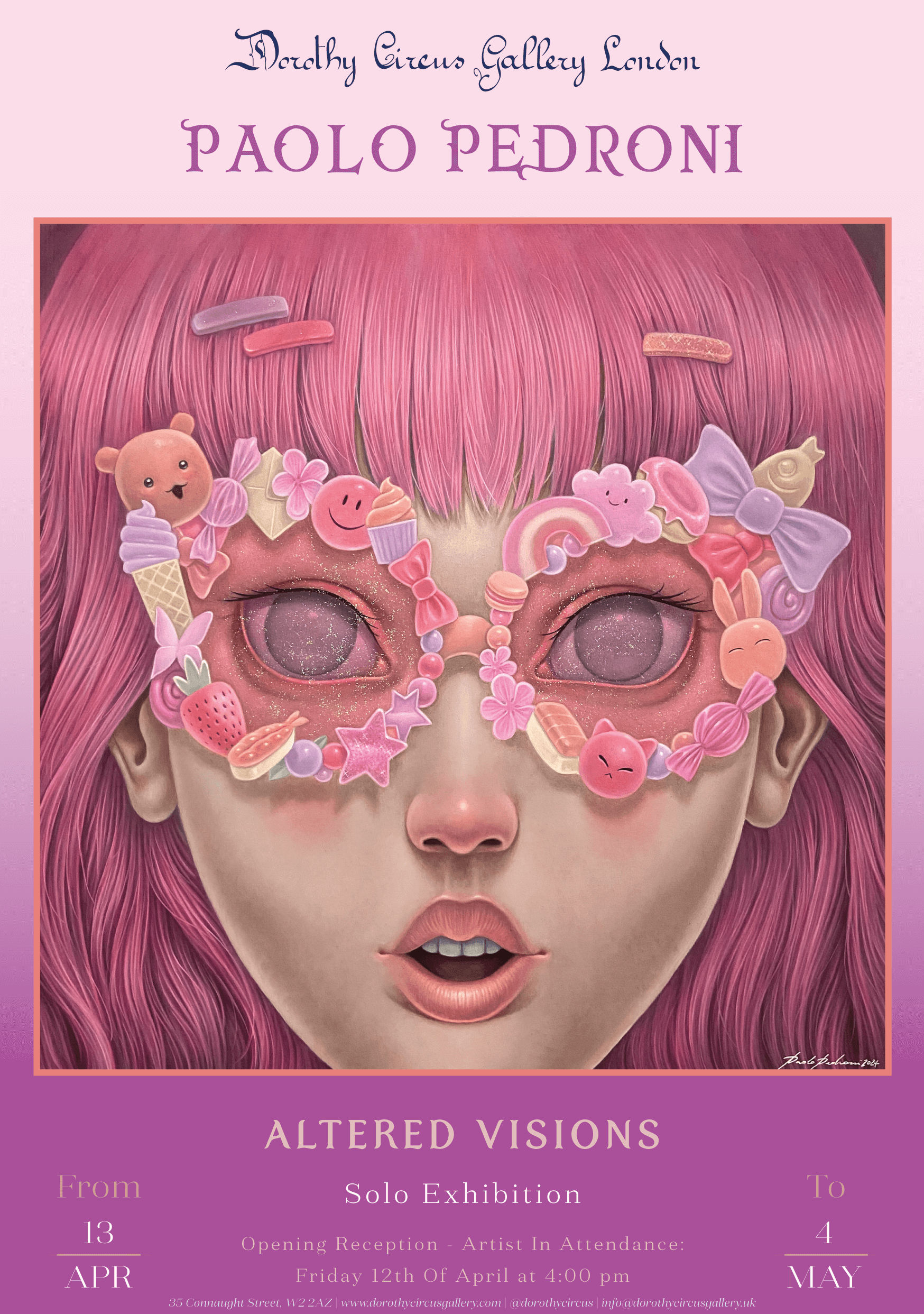 Following the phenomenal success at Art Taipei and a series of continuously sold-out shows, italian Paolo Pedroni now brings his first solo exhibition to London. Titled ‘Altered Visions’ his new collection is marked by distinctive and a fresh inspiration that weaves the concept of color as a metaphor for the accumulation of the unnecessary. This intriguing and magical narrative, presents vibrant hues contrasted with black and white, emphasizing the essence of subjects amidst the superfluous. We are invited to experience reality through two lenses: the ocular, filtering life's chaos, and the spiritual, revealing a purer, color-rich essence of what truly matters. With his blend of pop culture and profound social commentary, a masterful technique and stunning realism warp reality, Pedroni continues to astonish presenting a fantastical world viewed through rose-tinted lenses, where viewers are challenged to distinguish the essential from the excess in a blend of altered visions and paradoxical clarity.