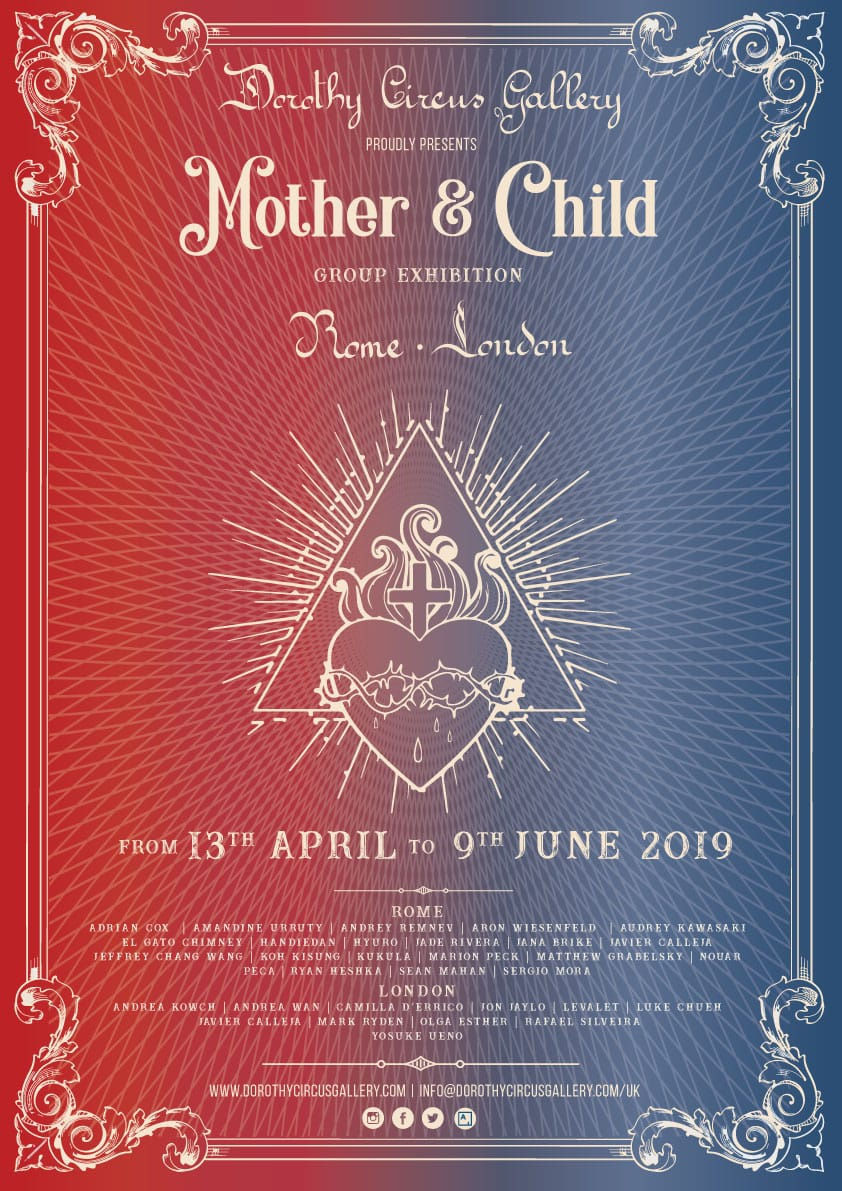 The Mother and Child group show will be held both at Dorothy Circus Gallery Rome and London and will showcase the works of more than thirty of our most famous and coveted International artists, such as: Adrian Cox , Andrey Remnev, Amandine Urruty, Aron Wiesenfeld Audrey Kawasaki, El Gato Chimney, Handiedan, Hyuro, Jade Rivera, Jana Brike, Javier Calleja, Jeffrey Chang Wong, Koh Kisung, Kukula , Marion Peck, Mark Ryden, Matthew Grabelsky, Peca, Ryan Heshka, Sean Mahan, Sergio Mora, TvBoy, Andrea Wan, Andrea Kowch, Camilla D’Errico, Jon Jaylo, LeValet, Luke Chueh, Javier Calleja, Olga Esther, Rafael Silveira, Yosuke Ueno.