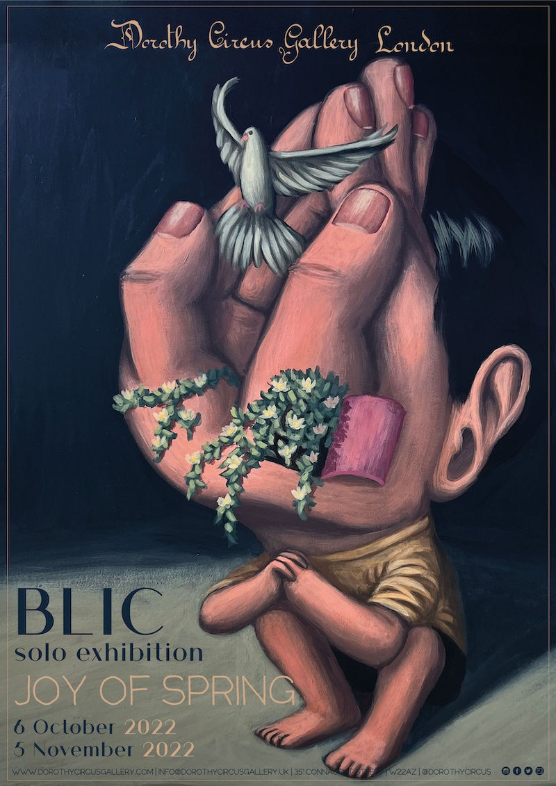 After his debut in Italy in 2020 at Dorothy Circus Gallery in Rome, Blic returns with a brand new series, this time in London. Dorothy Circus will present a solo exhibition on young street artist Blic whose extremely original, expressive and compelling visual code is now home to DCG. In his works, the main subject, both on canvas and on walls, is a personified human hand running through the streets. These distinctive characters recall the artist's personal stories and celebrate the powerful iconography of the hand as a tool of universal communication. Indeed, the central theme of his art are hands, the communication tool par excellence, in the era of the digital, that reflects his desire and determination of the artist to emerge and spread his voice across the globe, which reaches to us like a tennis ball thrown by a little boy from across the ocean.
