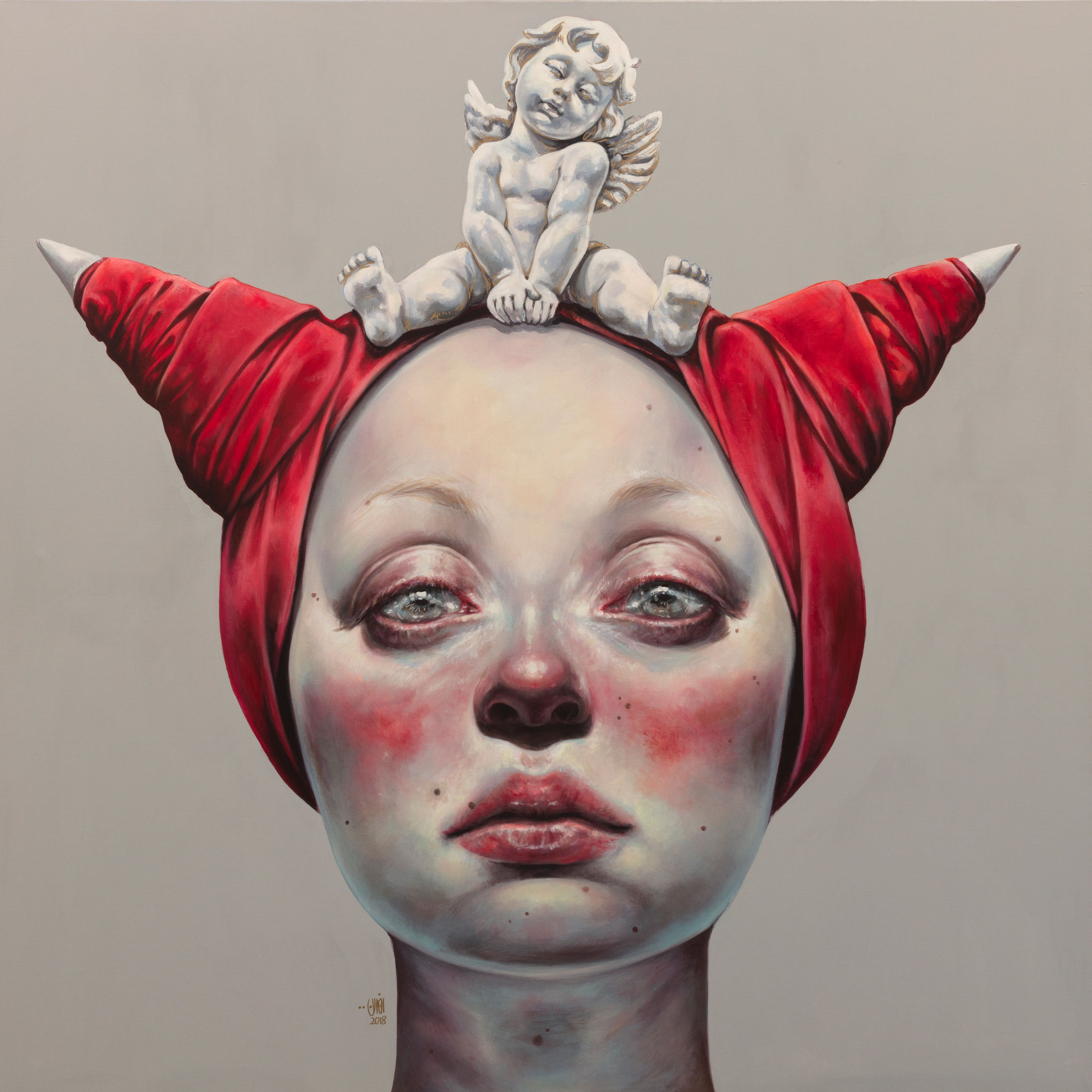 “When I paint portraits and I’m working on the details, I work in a manner very similar to close-ups in the cinema where the audience can learn about inner states and emotions of the character in that specific moment by getting closer to him/her. Generally speaking, I can’t claim to be an illustrator of the “inside”. Sometimes the inside is kept hidden by my subject’s silence, the only way to grasp it is through their gazes and the surrounding symbols; at other times, the inside is so highlighted that it strips them of all attributes of the human figure, transforming them to new creatures.”